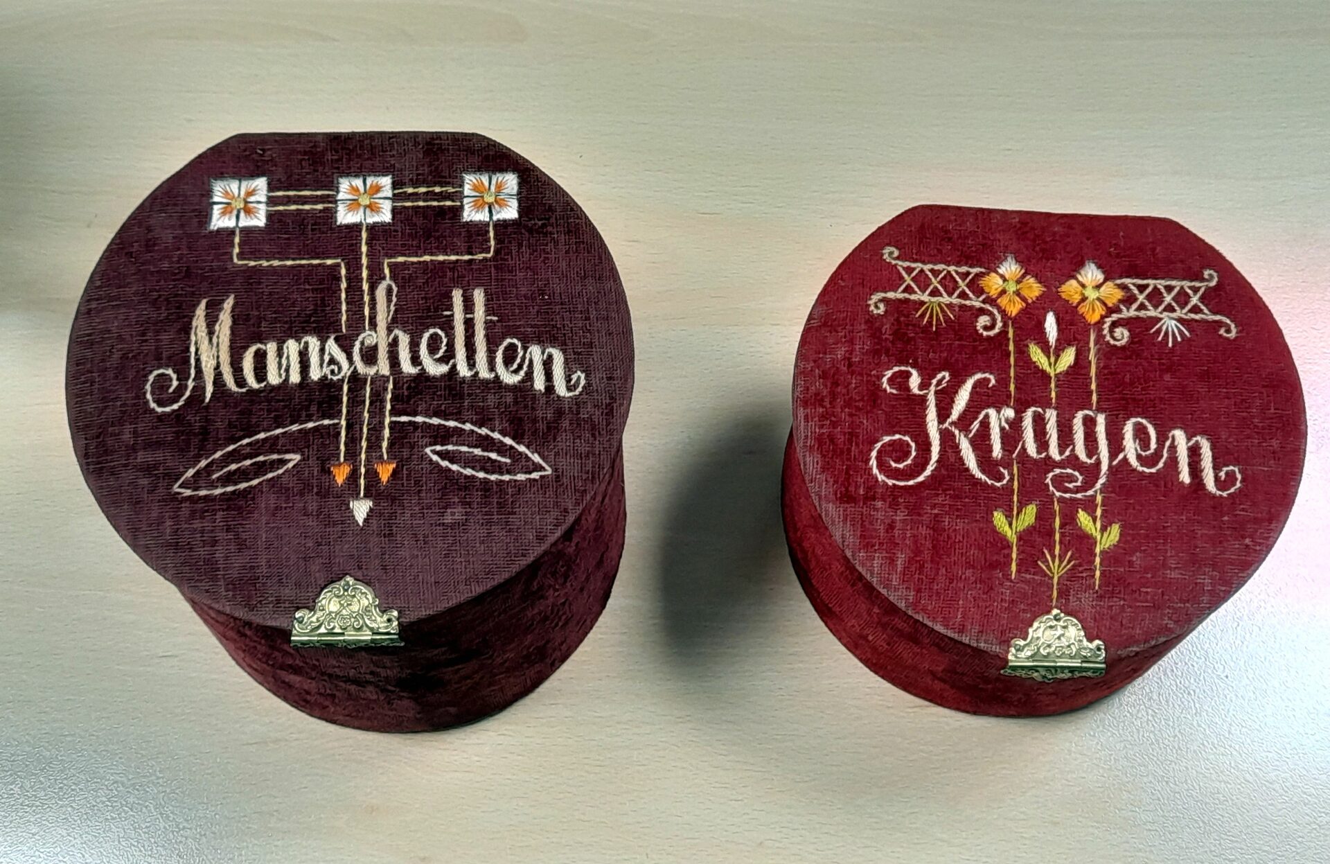 Marburg-Biedenkopf – Zwei runde, mit rotem Samt bezogene Pappschachteln sind im Oktober die Exponate des Monats im Hinterlandmuseum im kreiseigenen Schloss Biedenkopf. Stickereien mit Jugendstilmotiven zieren die Deckel, die mit vergoldeten, reich verzierten Metallschließen versehen sind. Die aufgestickten Bezeichnungen „Manschetten“ und „Kragen“ verraten den Verwendungszeck der Schachteln.