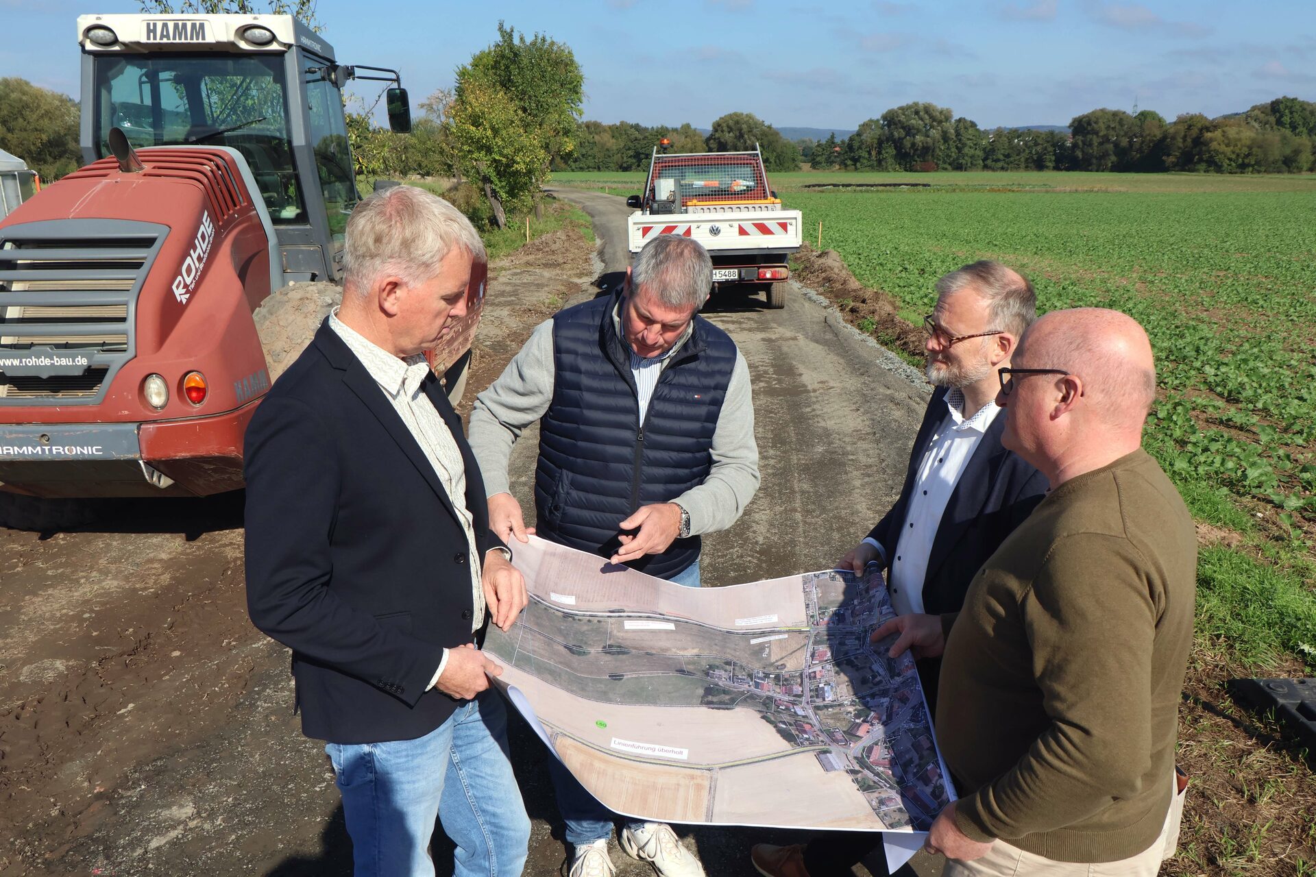Die Kosten liegen bei insgesamt rund 200.000 Euro. Die Arbeiten sollen bis Ende Oktober abgeschlossen sein. Landrat Jens Womelsdorf, Cölbes Bürgermeister Dr. Jens Ried und Karsten Dittmar, Leiter des Fachbereichs „Planen und Bauen“ der Stadt Marburg, verschafften sich einen Überblick über die Arbeiten.