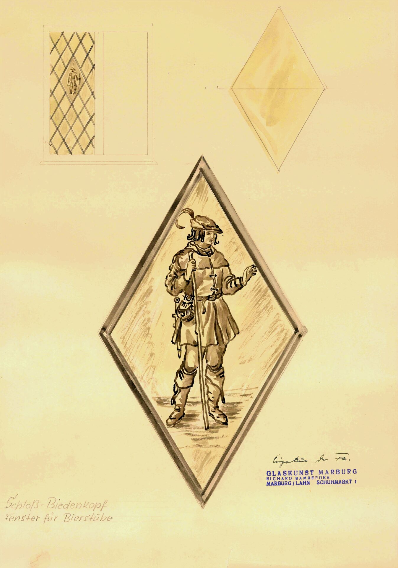 Zusammen mit weiteren Objekten wurde die Zeichnung kürzlich bei einem Umbau des Landratsamtes in Biedenkopf gefunden und dem Hinterlandmuseum übergeben. In dieser Sammlung an Objekten befindet sich ein weiterer Entwurf von Glasmaler Bamberger, diesmal für ein „Erkerfenster im Schloß Biedenkopf“. Gemeint ist wohl eines der Fenster im heute noch vorhandenen Erker des „Eisernen Heinrichs“. Als Bildmotiv war für das Fenster das farbig angelegte Wappen der Stadt Biedenkopf vorgesehen.