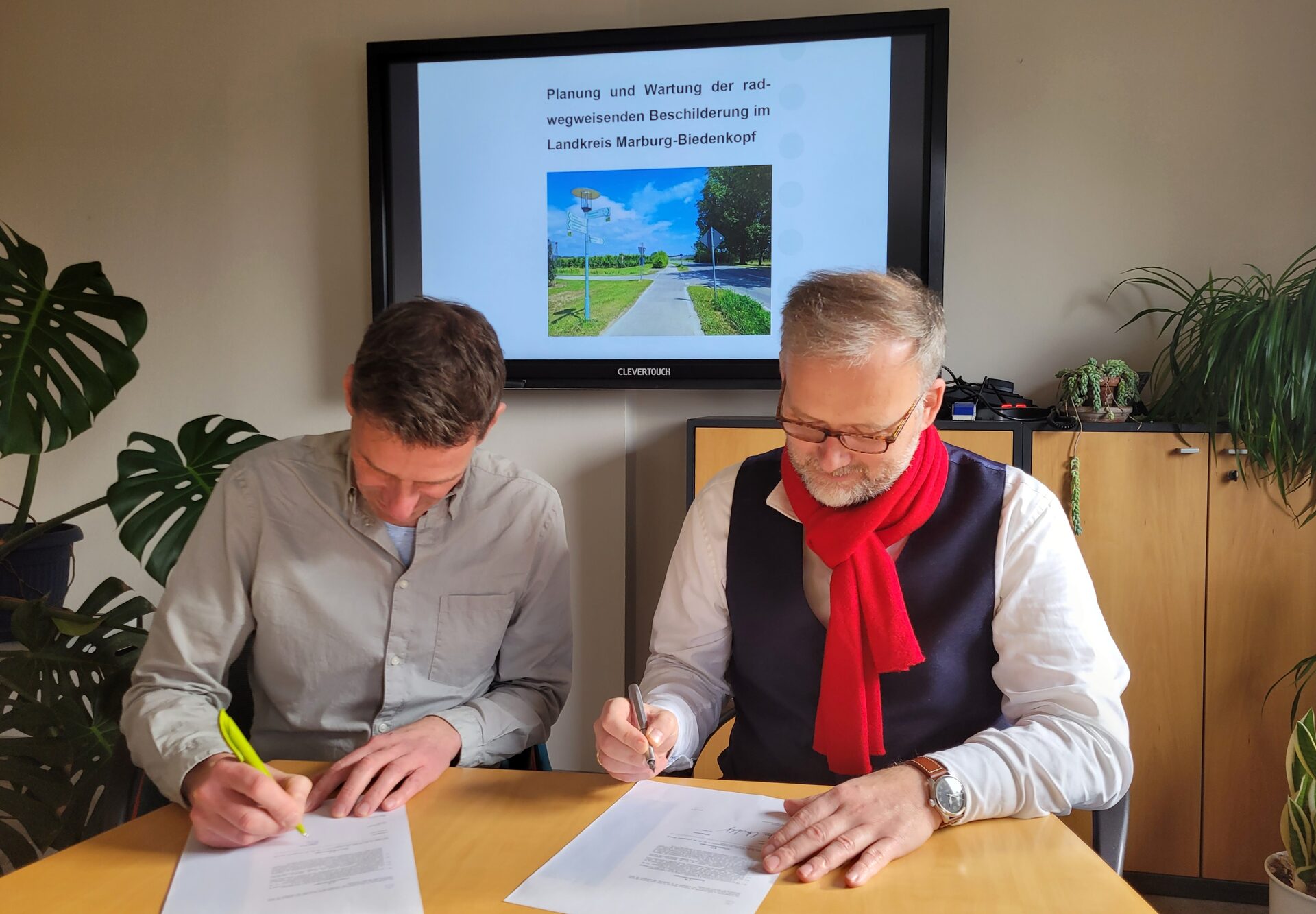 Marburg-Biedenkopf – Der Landkreis Marburg-Biedenkopf modernisiert die Wegweisung von Radwegen im Kreisgebiet. Insbesondere die Beschilderung soll wo nötig erneuert werden, um das aktuelle Radwegenetz im Kreis abzubilden. Denn eine klare Wegweisung ermöglicht die zuverlässige Reise mit dem Rad und ist deshalb wichtig für die Attraktivität und Sichtbarkeit des Radverkehrs. Den Auftrag für die Erneuerung übernimmt das Planungsbüro „VIA“ aus Köln, den entsprechenden Vertrag hat Landrat Jens Womelsdorf kürzlich mit Michael Schulze, Projektleiter bei „VIA“, unterzeichnet.
