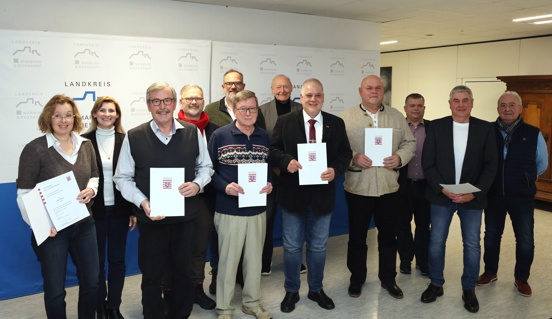 Marburg-Biedenkopf – Ausgezeichneter Einsatz für die Gesellschaft: Kathrin Neuser, Hans Kraft und Rainer Jäckel aus Lohra, Siegrfried Immel aus Dautphetal sowie die Neustädter Eckhard Sommer und Jan von Holten haben den Ehrenbrief des Landes Hessen erhalten. Landrat Jens Womelsdorf überreichte die Auszeichnungen im Marburger Landratsamt. Die Landesehrenbriefe sind ein Zeichen des Dankes und der Würdigung für langjähriges ehrenamtliches Engagement.