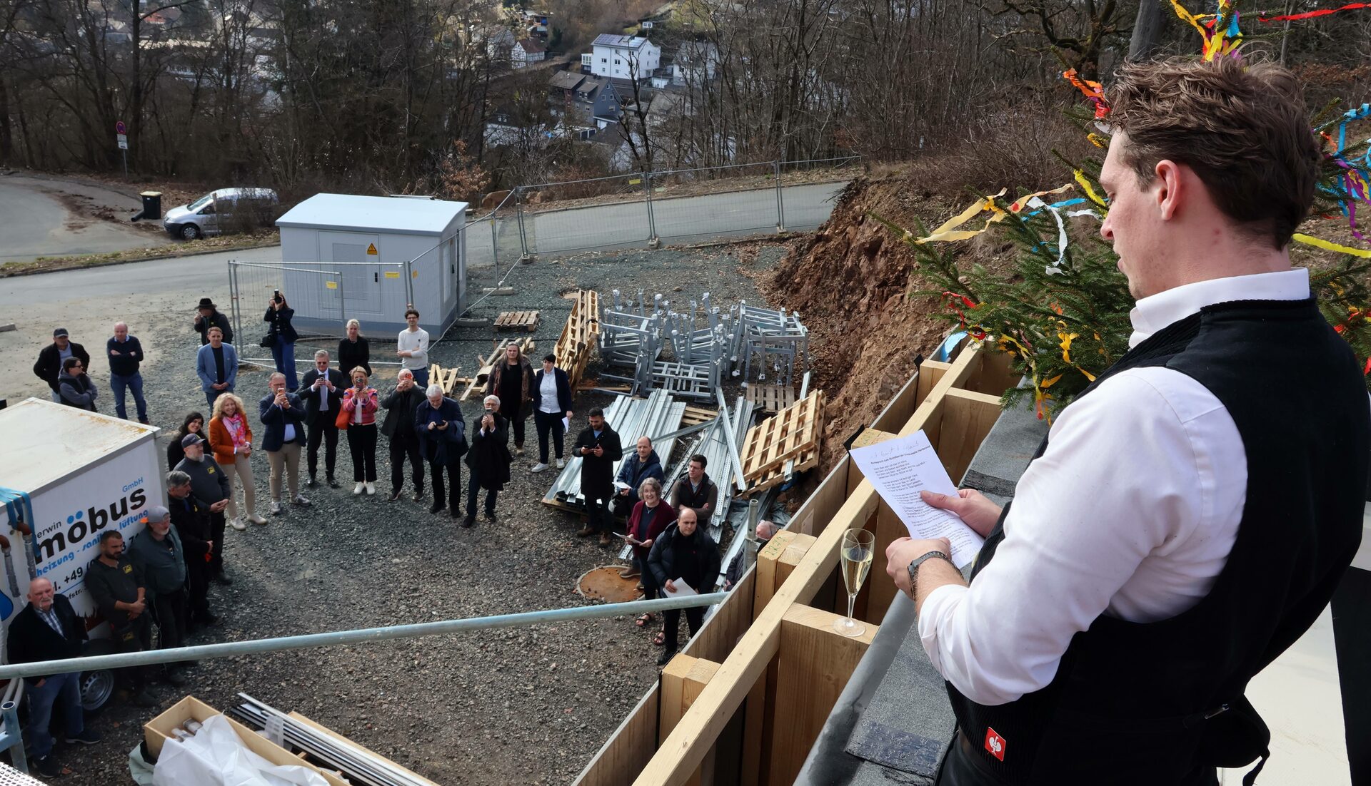 Der Erste Kreisbeigeordnete und Schuldezernent Peter Neidel betonte beim Richtfest am Dienstag, 3. März, den hohen technischen Standard der Halle. Ein Richtfest markiert traditionell den Übergang vom Rohbau zum Innenausbau und macht die Form der Halle nun deutlich sichtbar. „Der Neubau ersetzt die im Jahr 2025 abgerissene alte Sporthalle und wird nicht nur den schulischen und sportlichen Bedürfnissen der Vereine gerecht, sondern setzt auch neue Maßstäbe in Sachen moderner Gebäudetechnik“, betonte Neidel. Das neue Gebäude erfülle höchste Umweltstandards. Neben einer Photovoltaikanlage und Wärmepumpen zur Heizungsversorgung soll die Halle außerdem mit einer Anlage zur Nutzung von Regenwasser für die Toiletten-Spülung ausgestattet werden. „Mit dieser Ausstattung tragen wir maßgeblich zu einer energieeffizienten Nutzung bei“, macht Neidel deutlich.