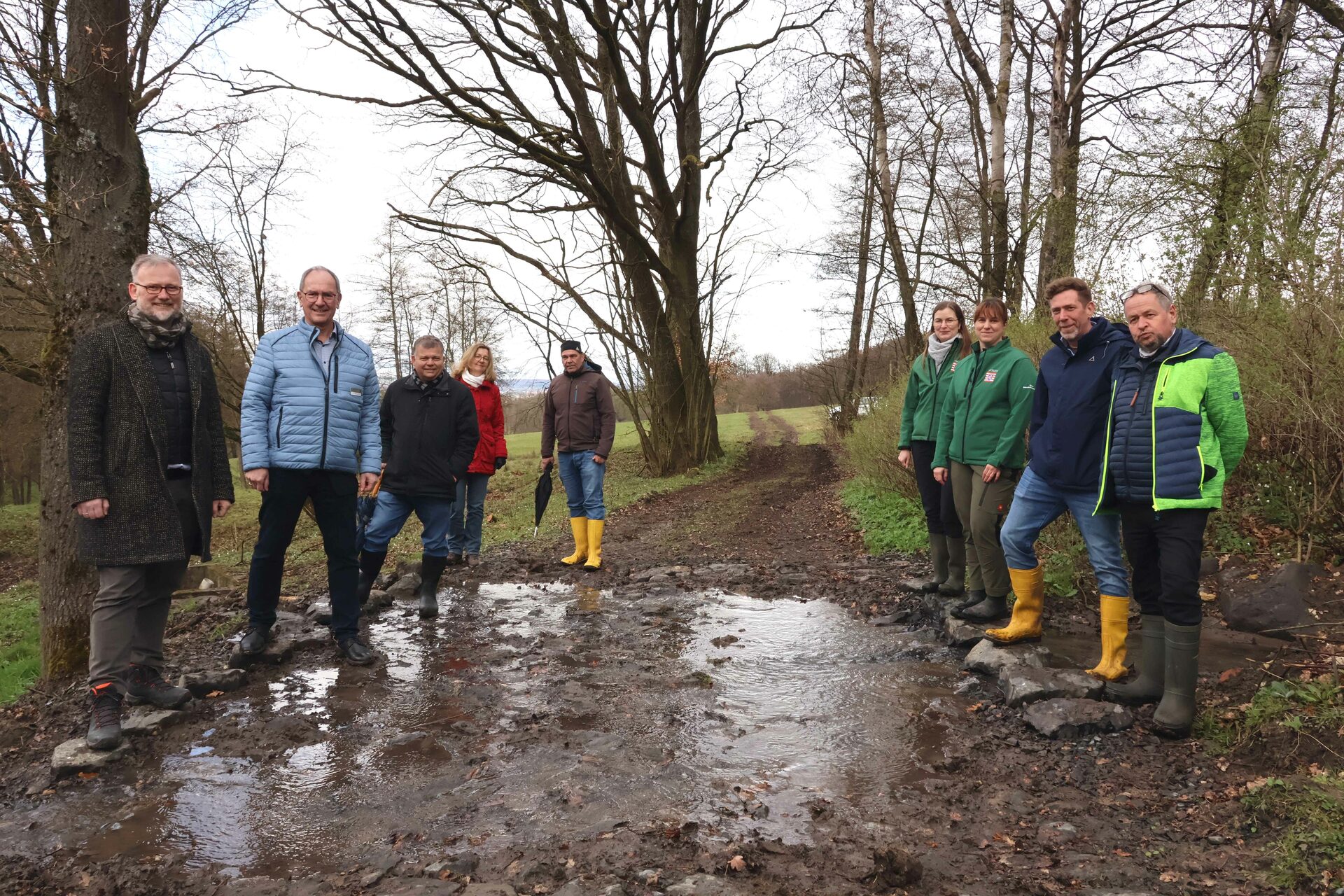 Rohrbruch einer historischen Wasserleitung vernässte Grünland und Wege großflächig