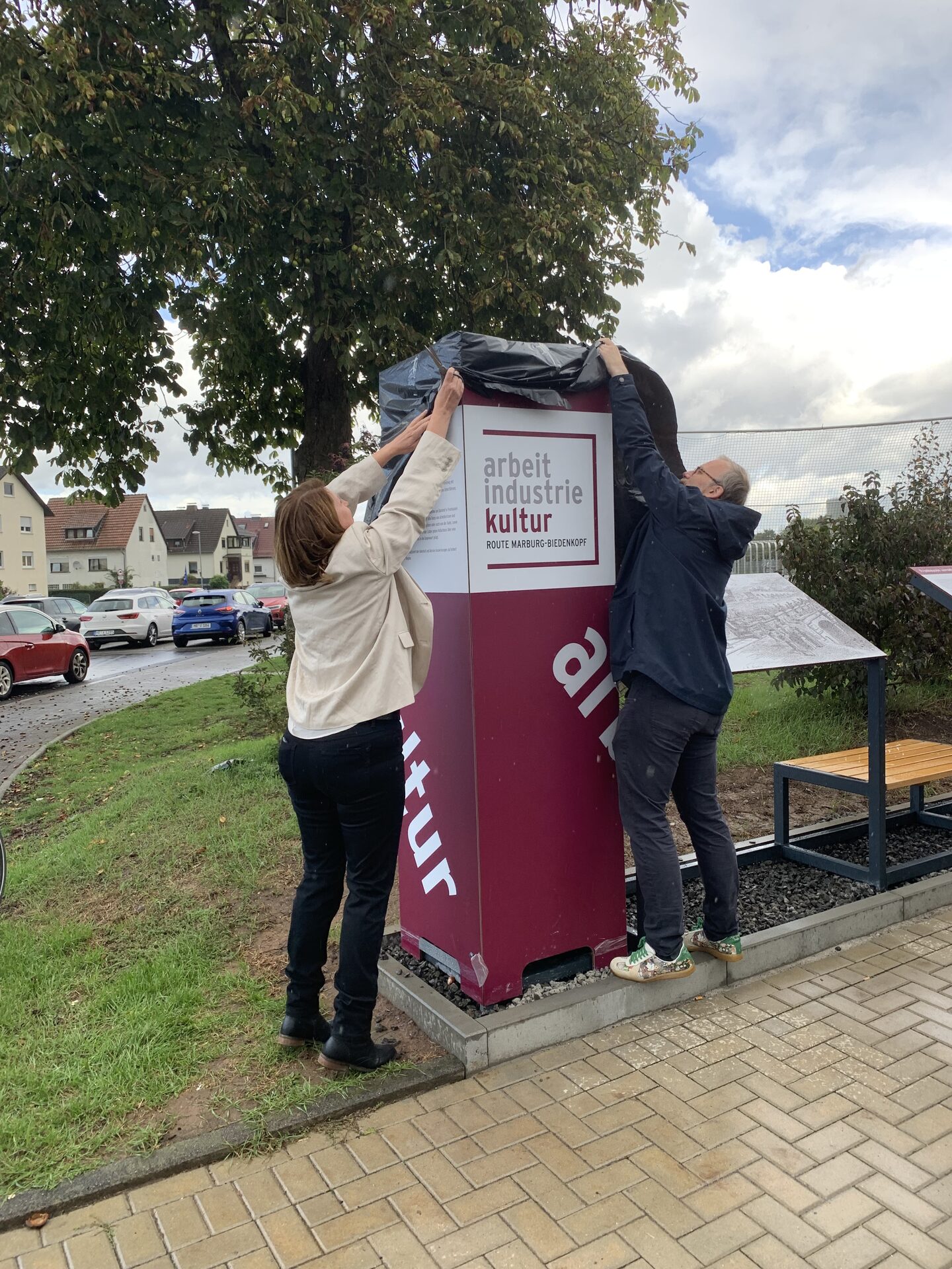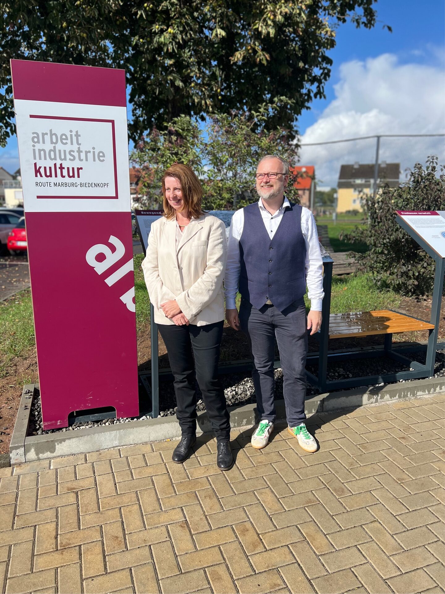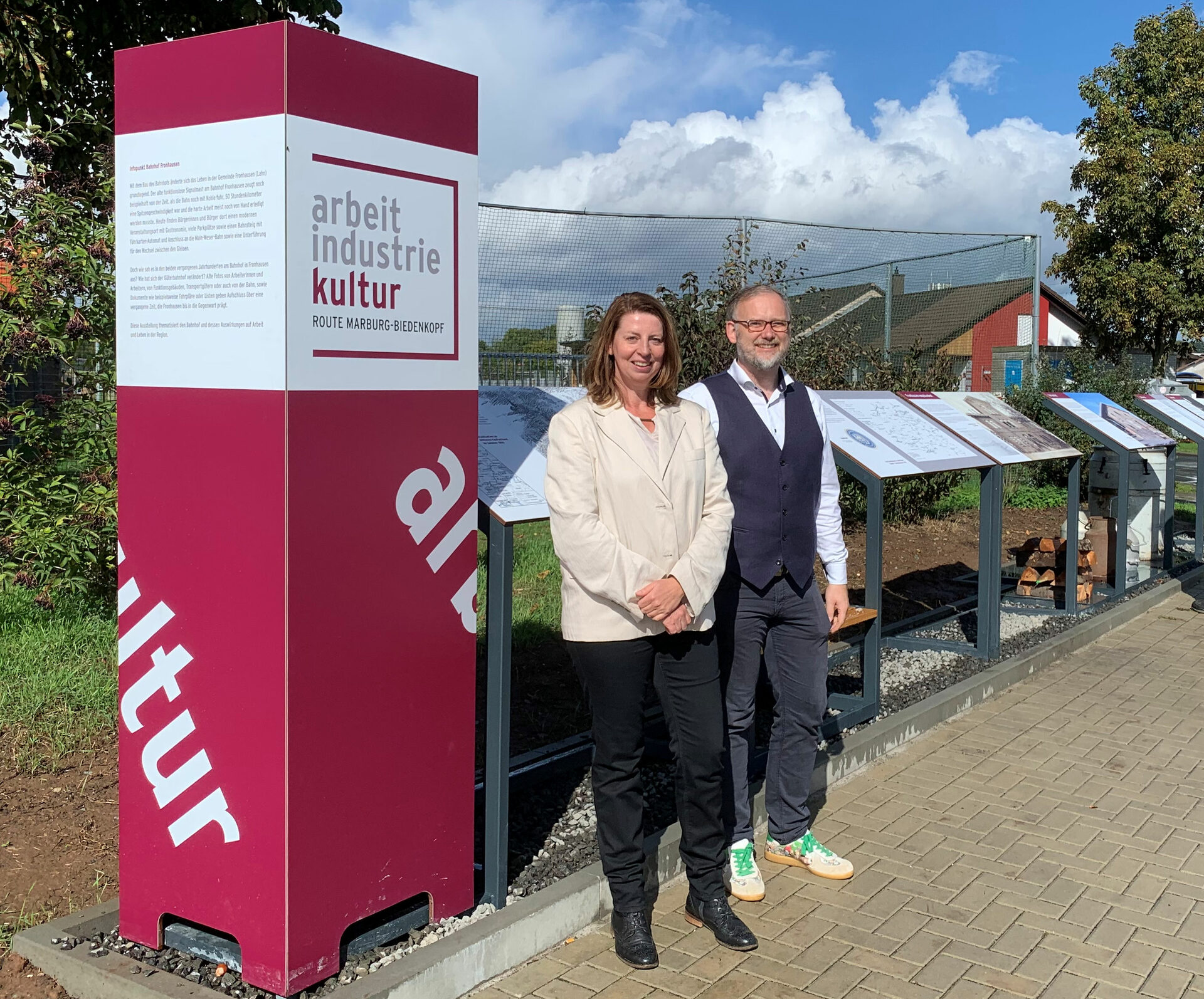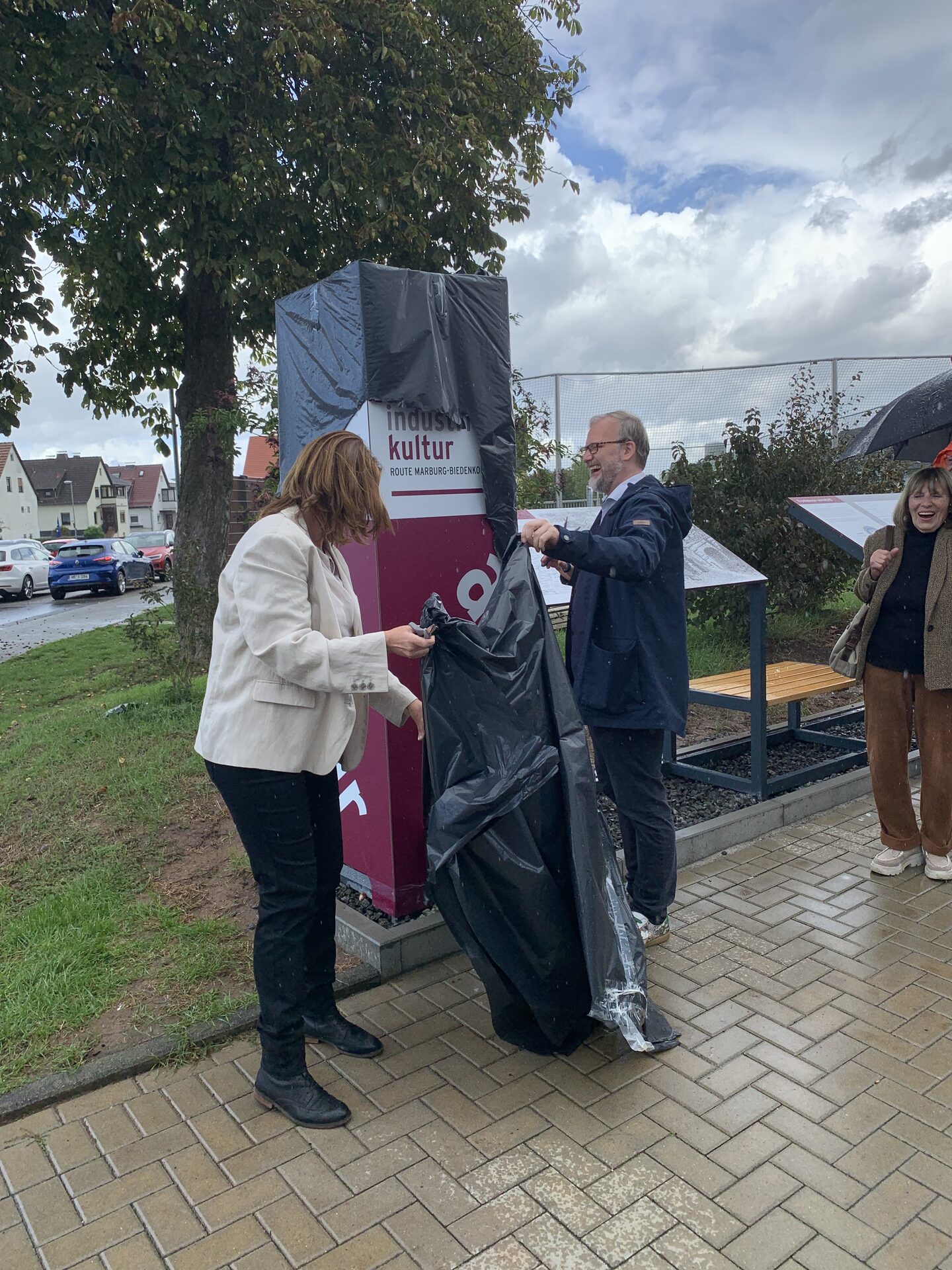 Gemeinsam haben Landrat Jens Womelsdorf und Bürgermeisterin Claudia Schnabel den sechsten und letzten Standort der Route der Arbeits- und Industriekultur in Fronhausen am Bahnhof eröffnet. Hier wird die Entwicklung des Ortes und der Region durch den Eisenbahnverkehr aufgezeigt.