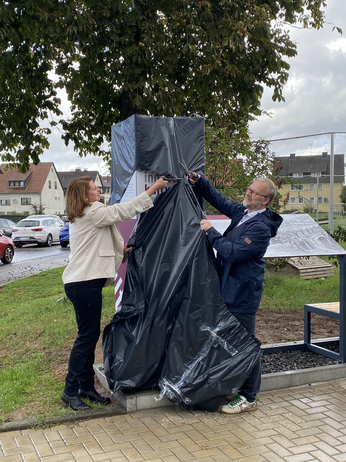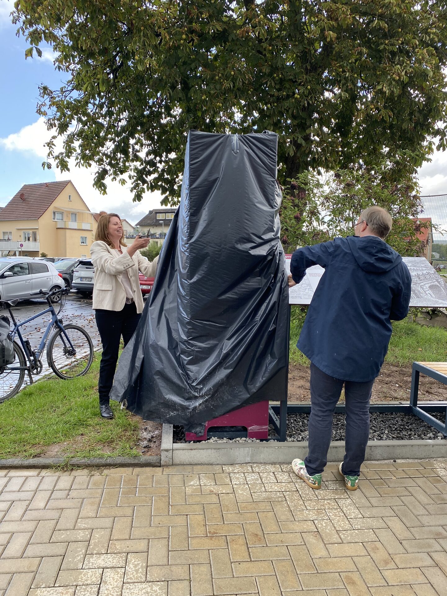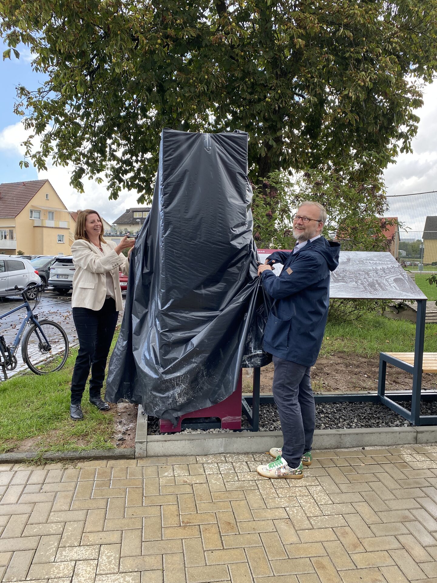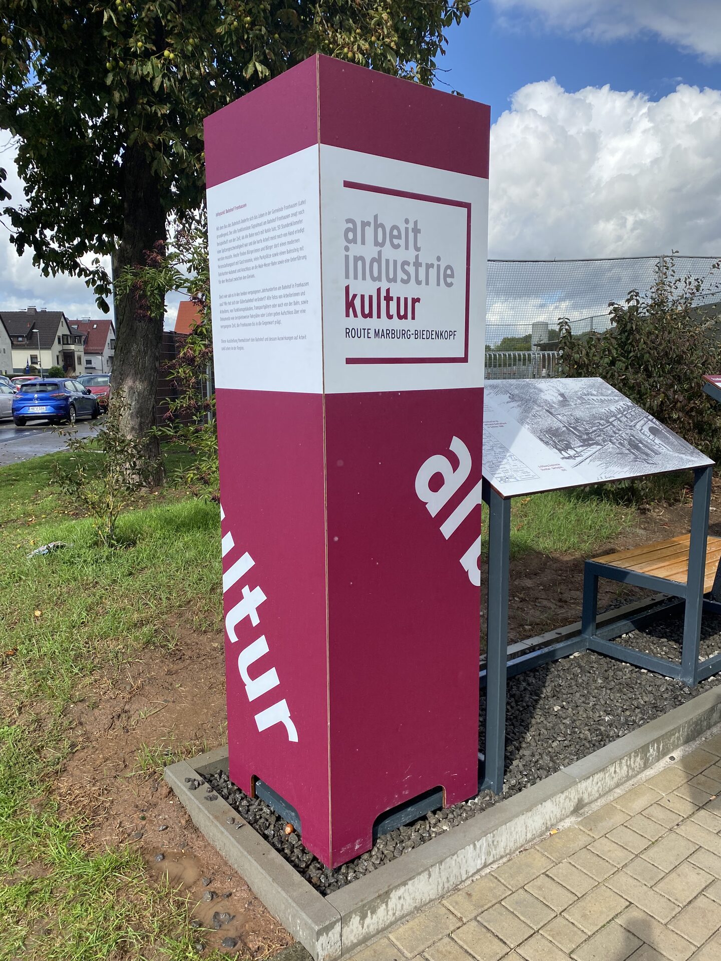 Gemeinsam haben Landrat Jens Womelsdorf und Bürgermeisterin Claudia Schnabel den sechsten und letzten Standort der Route der Arbeits- und Industriekultur in Fronhausen am Bahnhof eröffnet. Hier wird die Entwicklung des Ortes und der Region durch den Eisenbahnverkehr aufgezeigt.