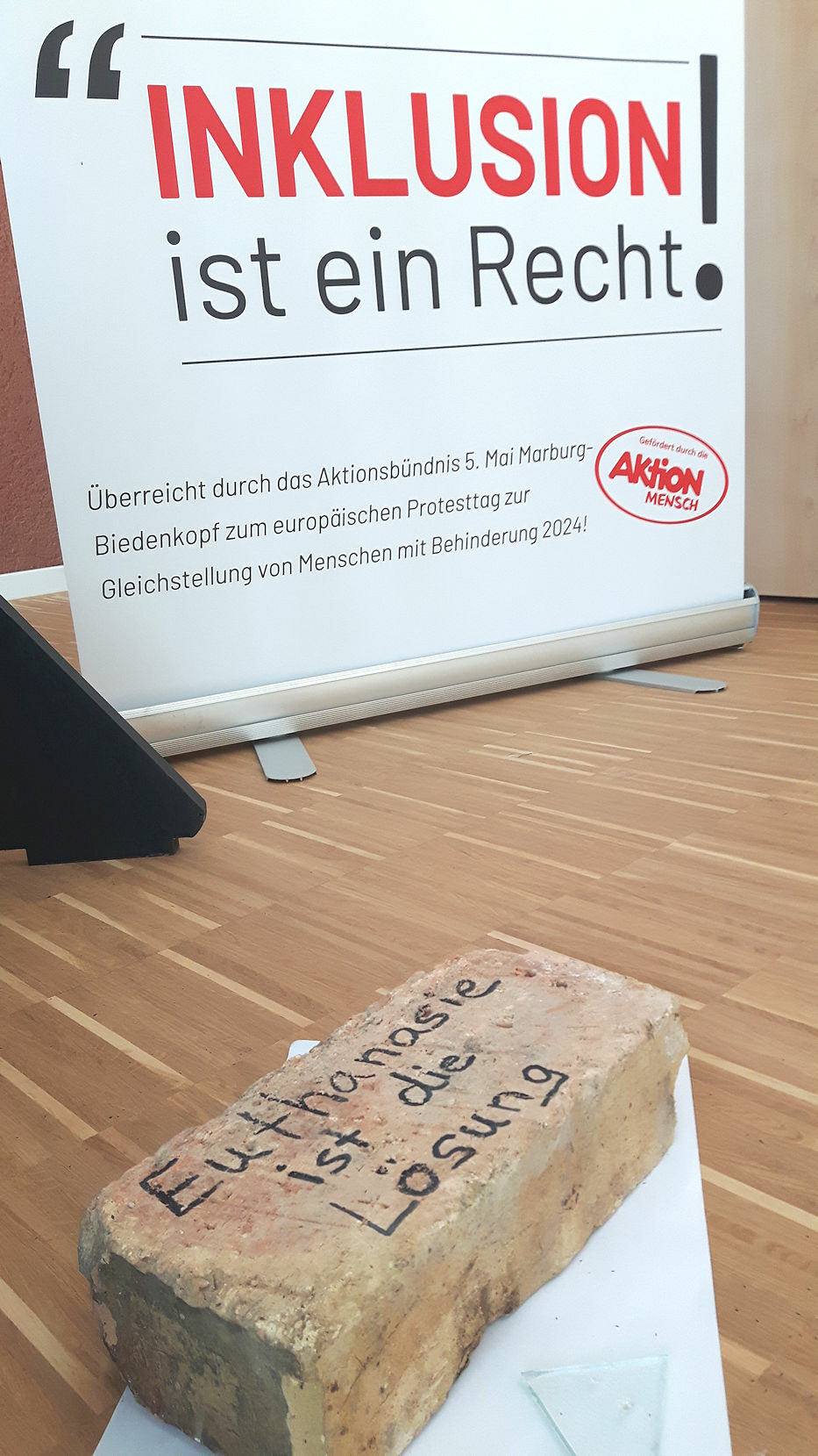 Geschichte passierte nicht irgendwo durch irgendwen, sondern die Verbrechen im Rahmen der Eugenik zwischen 1934 und 1945 wurden in den Landkreisen Marburg und Biedenkopf von Menschen aus diesen Landkreisen auch an Menschen mit Behinderung aus diesen Landkreisen begangen. Davon wird in der Ausstellung berichtet, auch mit einem Zeitstahl darüber, dass es bis Ende Januar 2025 gedauert hat, dass die Opfer unter den Menschen mit Behinderung durch Bundestagsbeschluss voll als Opfer des Nationalsozialismus anerkannt wurden.