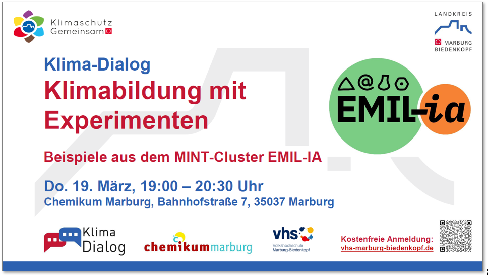 Der Klimawandel und seine Folgen prägen dauerhaft Politik, Wirtschaft und Gesellschaft und machen fundierte Klimabildung unverzichtbar. Nur wenn naturwissenschaftliche Zusammenhänge verstanden werden, können Maßnahmen zur Minderung und Anpassung Akzeptanz finden. Beim Klima-Dialog möchten wir einzelne Experimente aus den Workshops zeigen und die Angebote des MINT-Clusters EMIL-IA vorstellen.